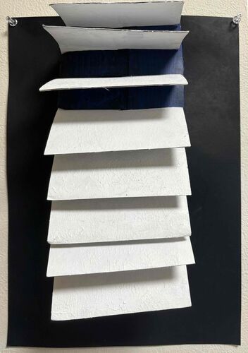 私が大学生の頃、初入選したP120号の白黒画像がInstagramの中にある。この絵はエスキースを何枚も描き、描く角柱の角度とか長さとか、計算しながら描いた。中心に空気を孕ませた風を表現したかった。これが若い頃の描き方だったが、今は全く変わってしまった…